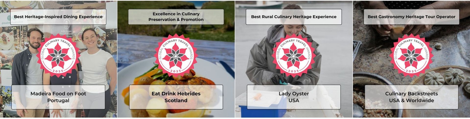 The World Food Travel Association is pleased to announce this year's finalist winners of the Global Culinary Travel Awards , celebrating excellence in culinary heritage, innovation, and authenticity in food and beverage tourism. Following a rigorous evaluation process, the panel of judges selected up to three semi-finalists per category. Then in final deliberations, judges were tasked with choosing only one finalist winner per category. An online press conference will be arranged to meet the winners. Any media professionals wishing to attend, please get in touch to request the link.